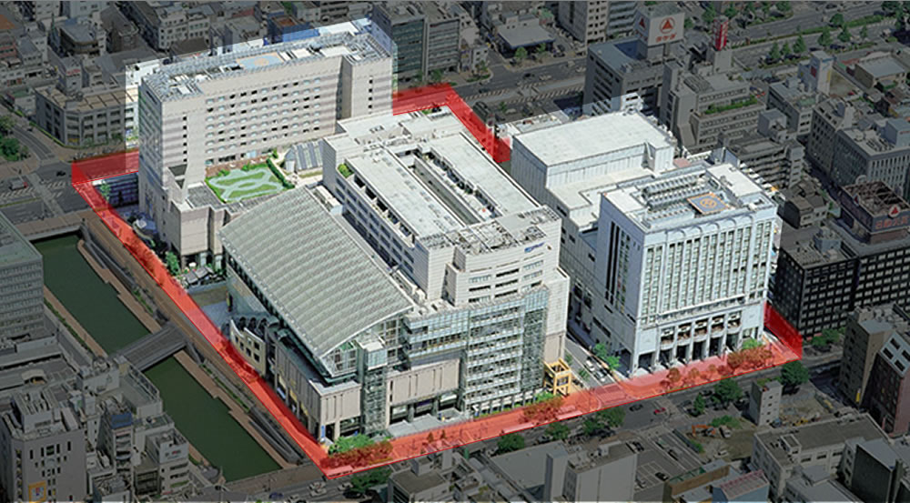 天神・博多駅両地区に挟まれた福岡市都心部のなかの博多部に位置し、博多の地域性・文化性を生かしながら商業核の形成を図るとともに、ターミナル機能の強化、隣接する天神・博多地区との連携及び独自の快適性にあふれた街づくりを行うことにより、商業振興と博多部全体の活性化を目指しています。