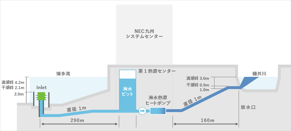 夏期は、外気温度より冷たく、冬期は、外気温度より温かい海水の持つ温度差エネルギーを活用した海水熱源ヒートポンプを採用しています。