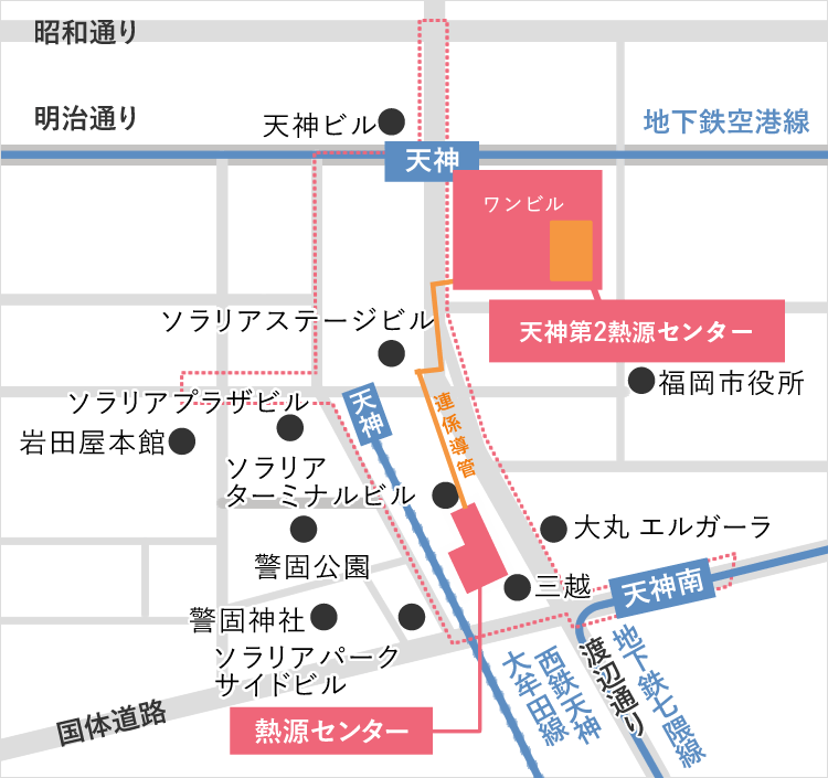 2025年1月、同地域に隣接する街区において、「天神ビッグバン」の一環として、福岡ビル、天神コアビル、天神第一名店ビルの一体開発として商業・ビジネス・ホテル・カンファレンスなど多様な機能を網羅する、九州屈指の規模を誇る大型複合ビル「ONE FUKUOKA BLDG.」(ワンビル)に熱供給を開始することとなり、当該ビル5階に天神第2熱源センターを設置しました。既存の天神熱源センターとは導管で連携しています。