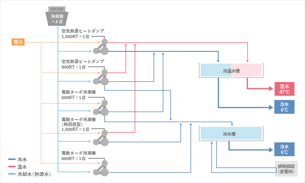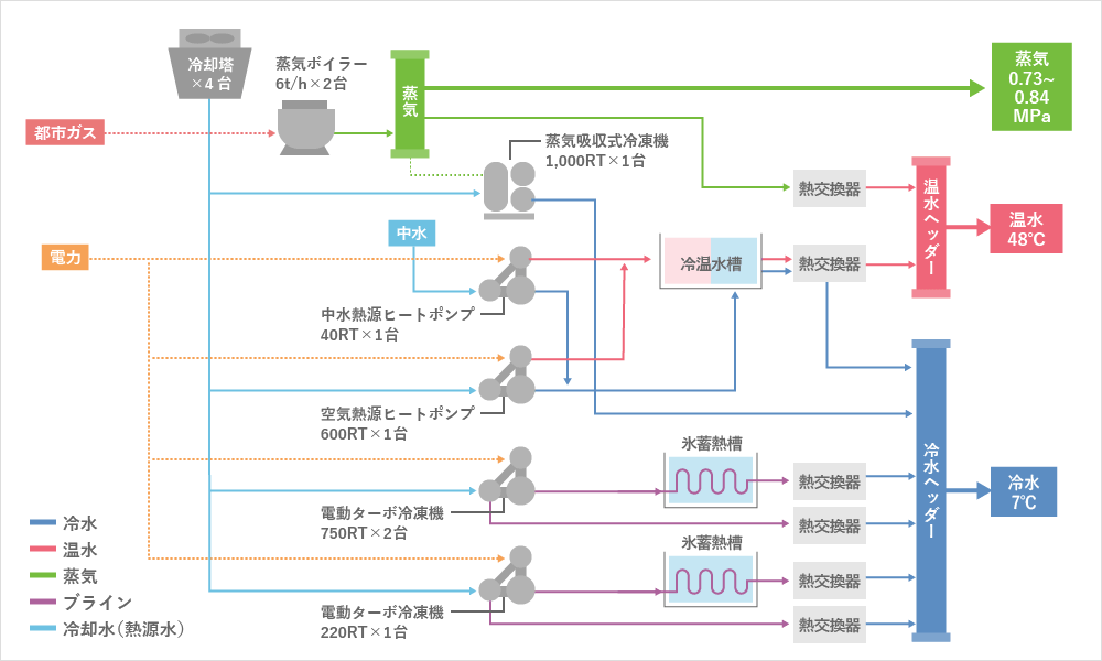 空気熱源ヒートポンプ(水蓄熱槽)、電動ターボ冷凍機(氷蓄熱槽)及び蒸気ボイラ、吸収式冷凍機による電気・ガスのベストミックスを採用しています。