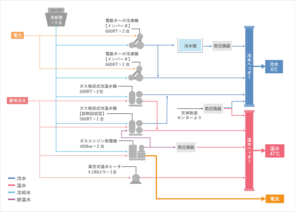 | 地域導管 | 管 径:125A~900A 総延長:冷水管4,572m(往復)/温水管4,686m(往復) |